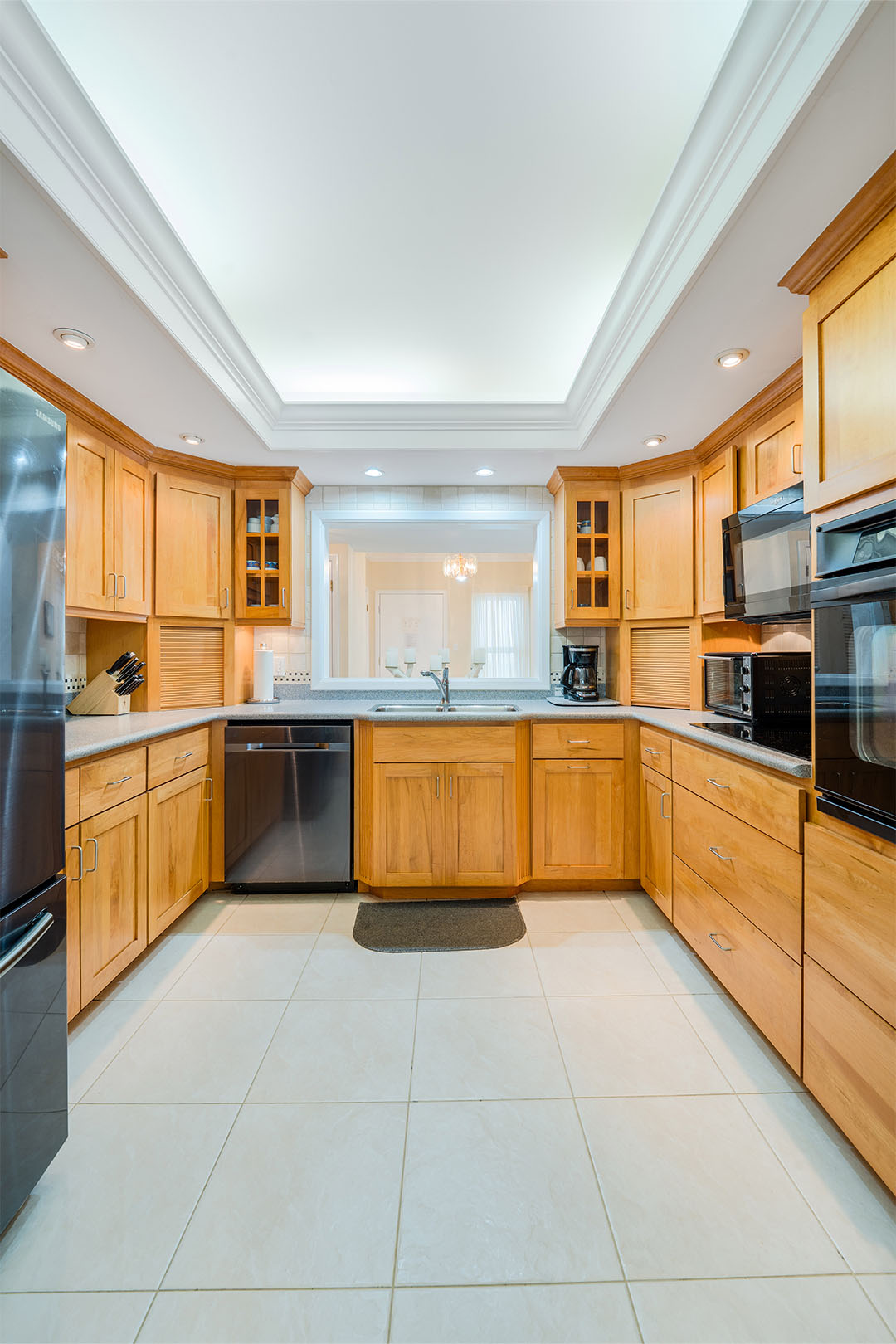 The fully equipped, open-concept kitchen showcases Corian countertops, hardwood cabinetry, and stainless-steel appliances for all your cooking and entertaining needs. The expansive living and dining spaces are appointed with contemporary sofas and accents, elegant tile flooring, and seating for six at a rustic wooden dining table.